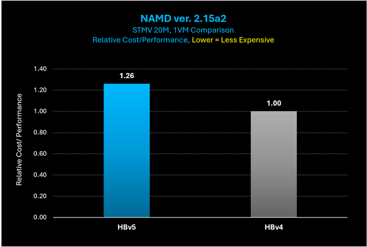 Figure 17: The cost to complete the NAMD STMV 20M case is 26% higher on HBv5 than what it costs to complete the same case on HBv4