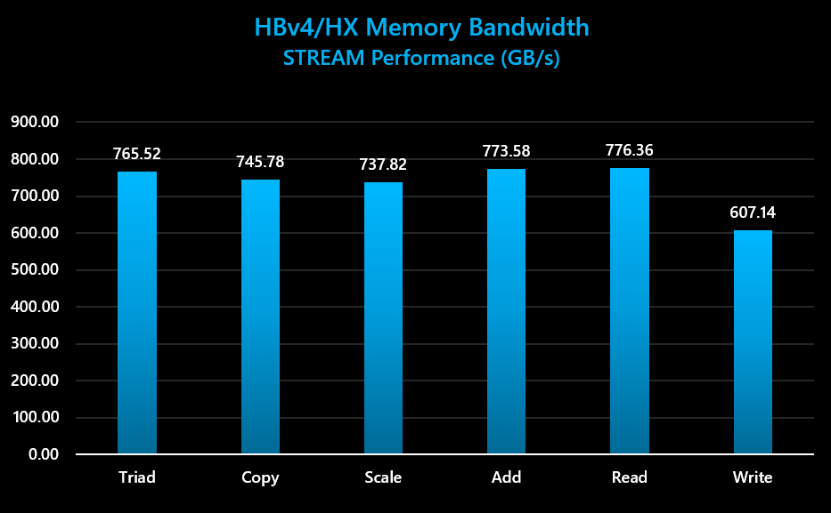 Figure 1: STREAM-TRIAD measures 765.52GB/s Memory Bandwidth for HBv4/HX series VMs