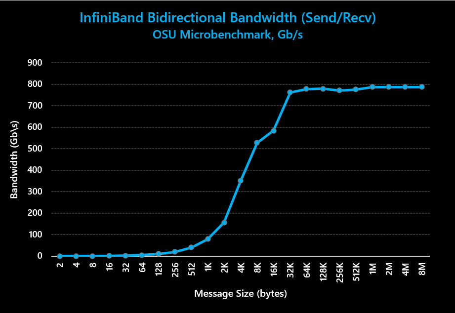 Figure 3: Bi-directional InfiniBand bandwidth measuring up to the expected peak bandwidth of 800 Gb/s