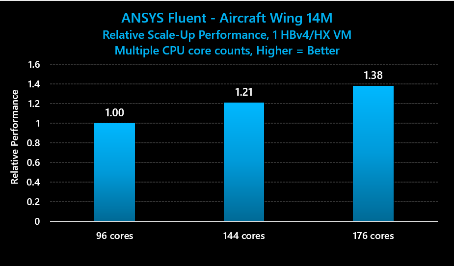 Figure 5: On Ansys Fluent (Aircraft Wing 14M) performance increases an additional 38% from the 96-core VM size to the 176 core VM size, illustrating the tradeoff between per-core v. per-VM performance.