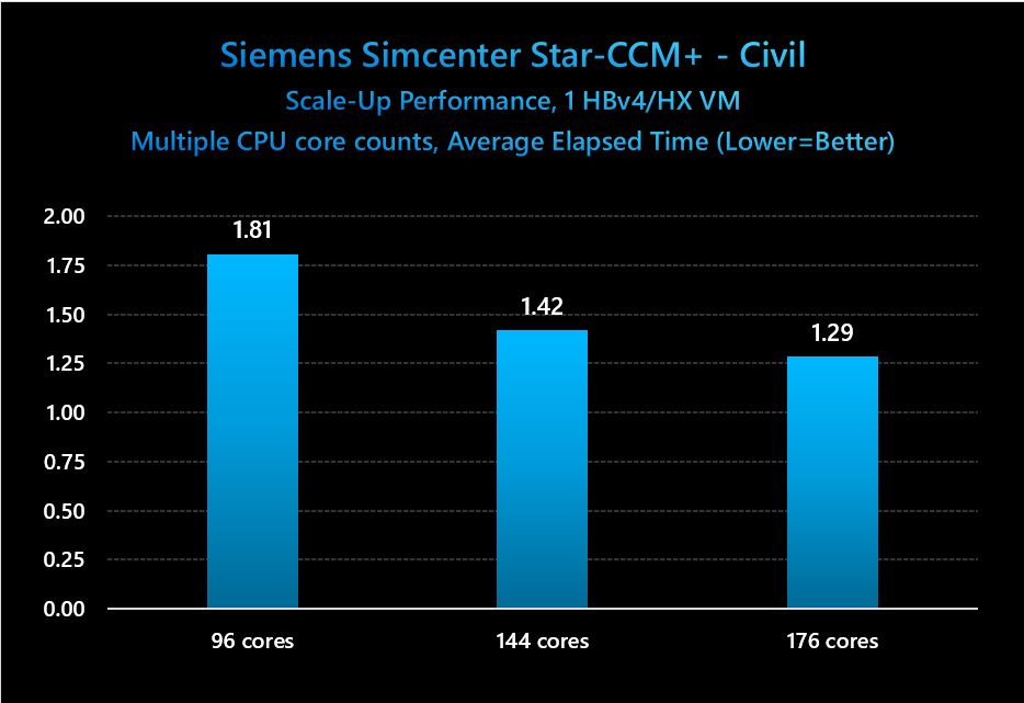 Figure 7: On Siemens Simcenter STAR-CCM+ (Civil) time to solution decreases by nearly 40% from the 96-core VM size to the 176 core VM size, illustrating the tradeoff between per-core v. per-VM performance.