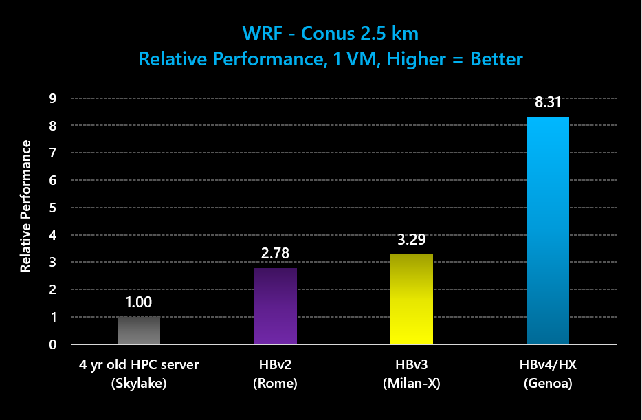 Figure 11: On WRF (Conus 2.5km) HBv4/HX VMs provide more than a 8x performance uplift compared to a 4 year-old HPC server, and more than 2x compared to the most recent Azure HPC VM, HBv3-series.