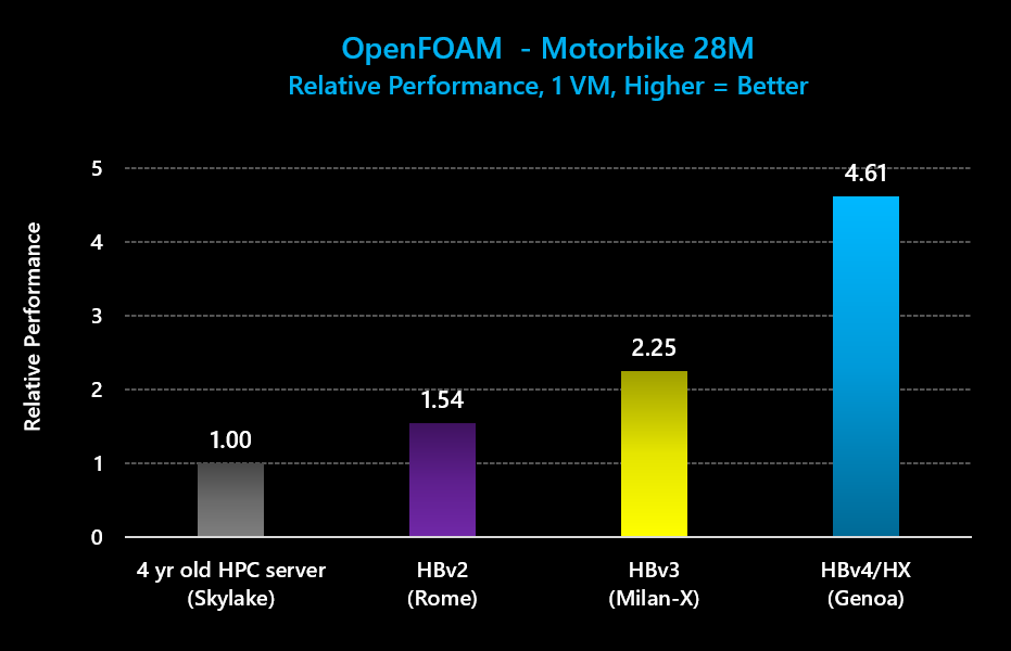 Figure 8: On OpenFOAM (Motorbike 28M) HBv4/HX VMs provide more than a 4x performance uplift compared to a 4 year-old HPC server, and more than 2x compared to the most recent Azure HPC VM, HBv3-series.