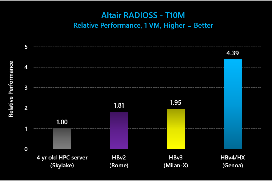 Figure 9: On Altair Radioss (T10M) HBv4/HX VMs provide more than a 4x performance uplift compared to 4 year-old HPC server, and more than 2x compared to the most recent Azure HPC VM, HBv3-series.