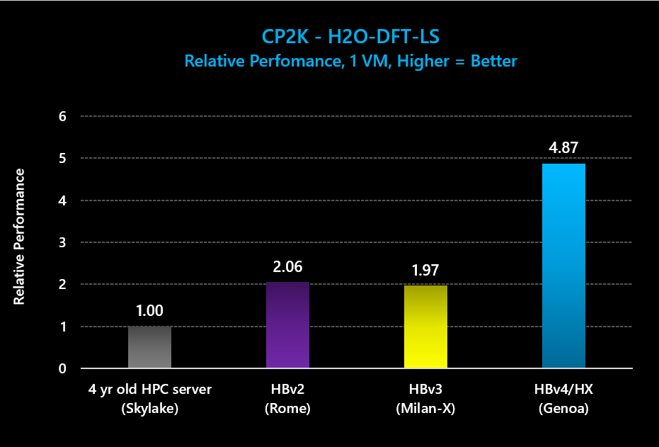 Figure 14: On CP2K (H2O-DFT-LS), HBv4/HX VMs provide nearly a 5x performance uplift compared to 4-year-old HPC server, and nearly 2.5x compared to the most recent Azure HPC VM, HBv3-series.