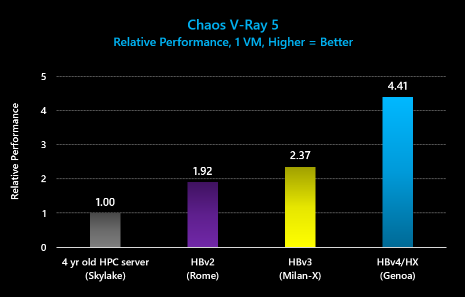 Figure 13: On V-Ray 5, HBv4/HX VMs provide more than a 4x performance uplift compared to 4-year-old HPC server, and 1.86x compared to the most recent Azure HPC VM, HBv3-series.