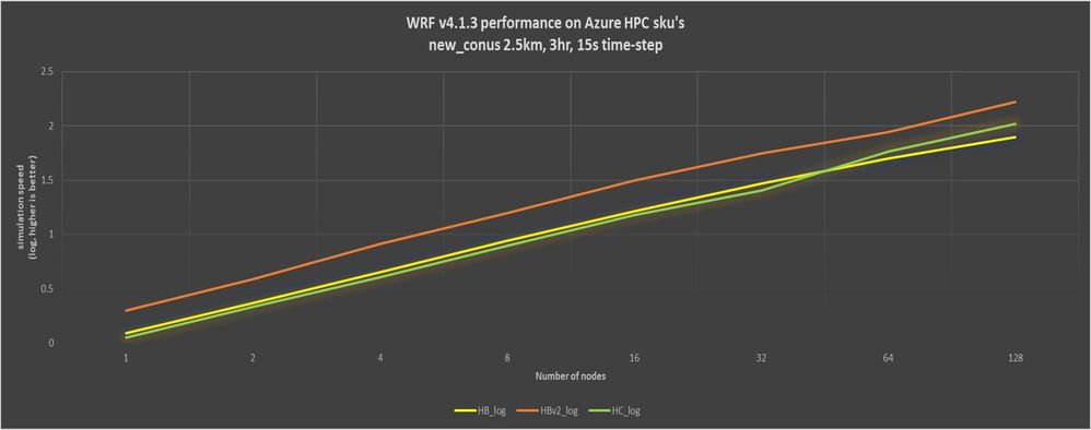 Figure 2. WRF v4 parallel scaling on HBv2, HB, and HC VMs (log simulation speed).