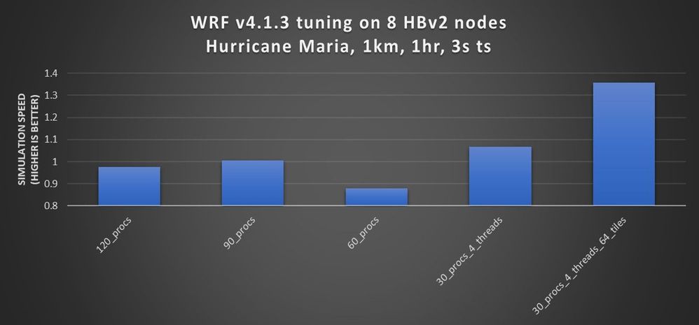 - WRF v4 performance improves considerably on HBv2 VMs—by about 30 percent—when you carefully lay out processes and threads and optimize the HBv2 NUMA domains, memory bandwidth and L3 cache (Figure 3). In the case of maria1km, hybrid parallel WRF is only effective with up to 128 nodes (Figure 4) when there is enough work per processor to divide each patch into tiles that the Open MP threads can work on. This technique keeps more data in L3 cache, and we see improved performance. A smaller number of nodes performs better with a higher tile count, and larger node counts perform better with a smaller tile count. Typically, when you find the optimal number of tiles for a particular number of nodes, the number of tiles is halved each time you double the number of nodes to achieve the best performance. In the maria1km case, when more than 128 nodes were used, hybrid parallel WRF did not help. It was best to use the MPI-only version and have 90 processes per node for best performance on HBv2 VMs.