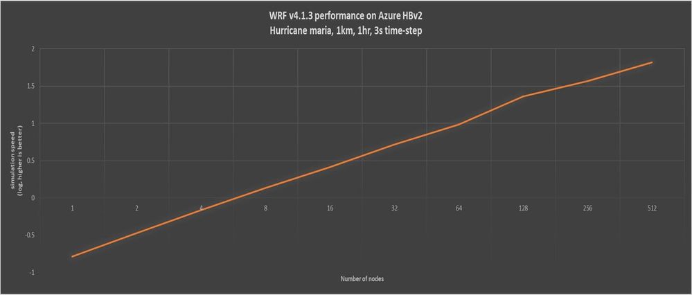 Figure 5. WRF v4 parallel scaling on HBv2 (log scale). WRF v4 running the maria1km case had a parallel efficiency of about 80 percent on 512 HBv2 nodes.
