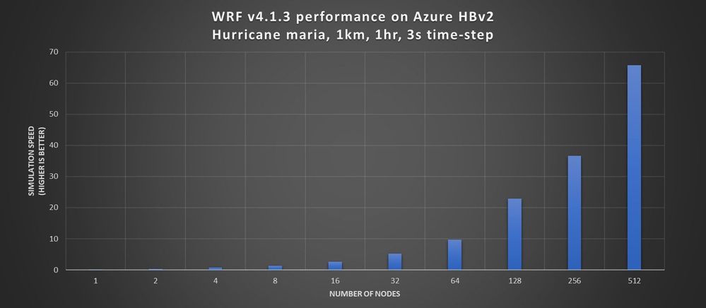 We applied performance optimizations to WRF v4 running a large Hurricane Maria 1km model on HBv2 VMs. We wanted to see how well the large Hurricane Maria 1km model would scale on this VM type.