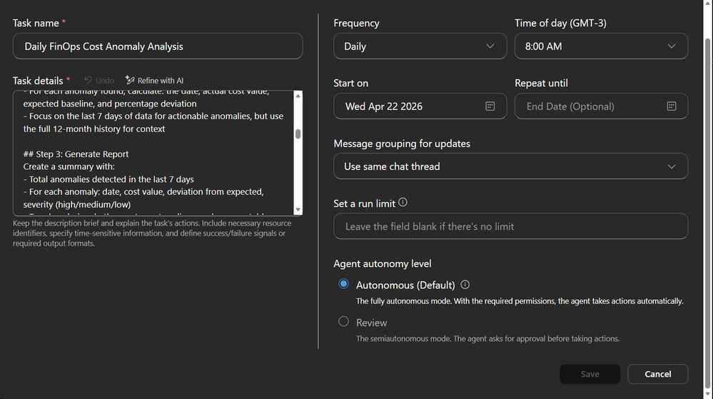 "Crie uma tarefa diária para analisar anomalias de custo no FinOps Hub e me notificar pelo Teams quando houver anomalias detectadas."