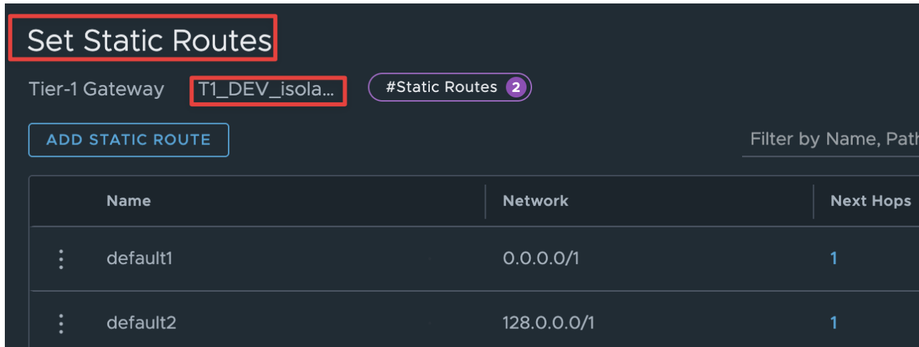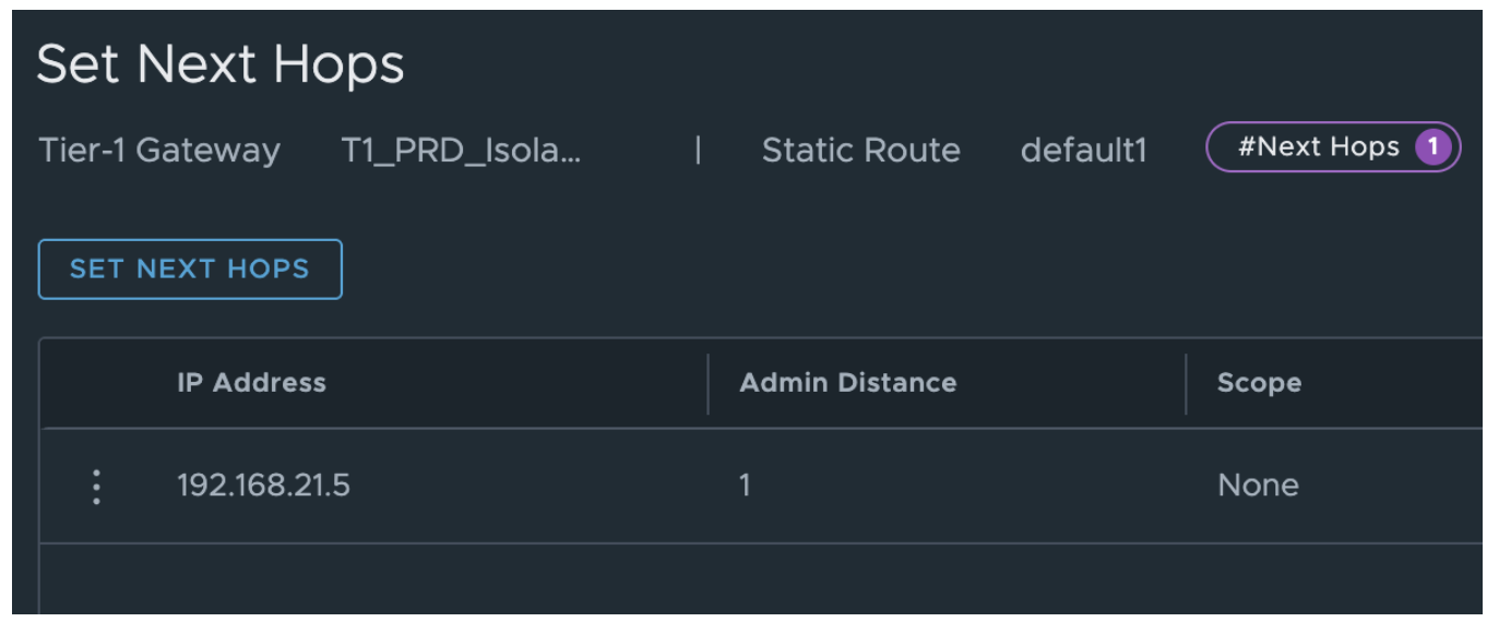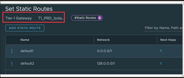 Estarei criado uma rota default ( 0.0.0.0/0 ) , com next hop para a interface do Inside do PFsense (192.168.21.5 ) conectada ao Gateway T1 PRD. Devido a limitações do NSX, é necessário "quebrar" em duas: 0.0.0.0/1 e 128.0.0.1/1