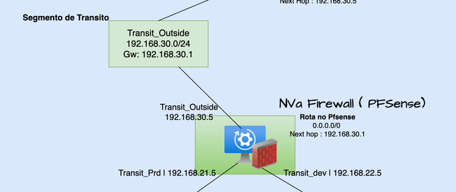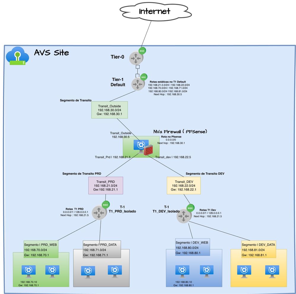 Neste artigo eu demonstro e um laboratório prático de inspeção de tráfego Norte-Sul e Leste-Oeste, fazendo isolamento por ambiente (DEV/PRD) dentro do Azure VMware Solution (AVS) usando NSX-T (Tier-0/Tier-1) e um Firewall NVA (pfSense) implantado no SDDC. Também serão demonstradas as principais configurações no NSX (criação/associação de segments, gateways T0/T1 e ajustes de roteamento necessários para forçar o tráfego a passar pela NVA).