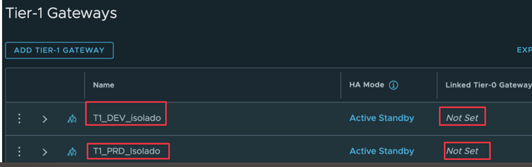 Importante: Estes Segmentos estarão conectados ao Tier-1 Gateway PRD (T1_PRD_Isolado) e DEV ( T1_DEV_Isolado) respectivamente criados na etapa anterior