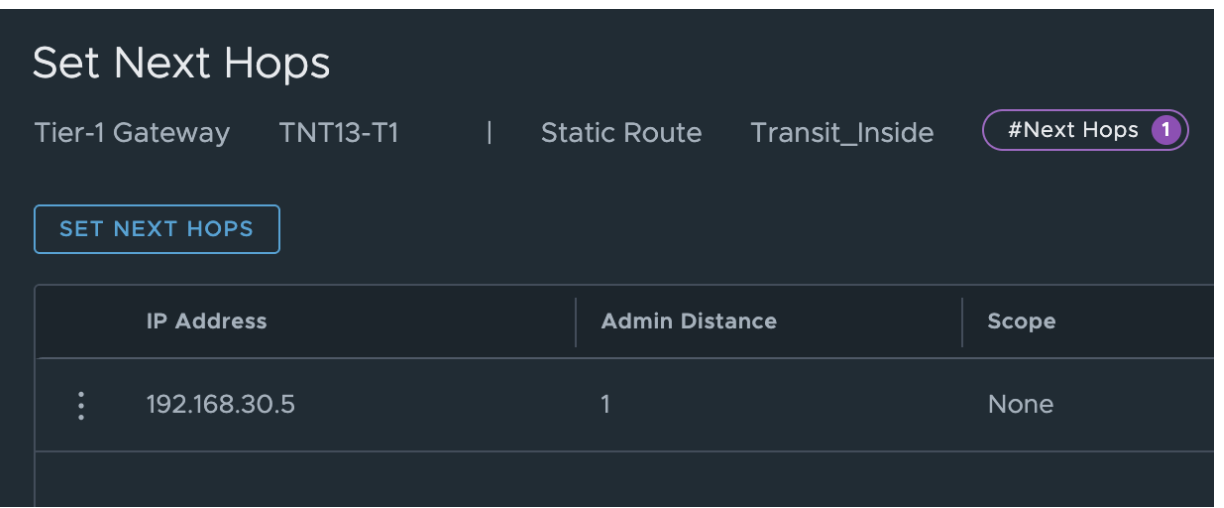 Next Hop aqui é o ip da interface Outside do PFsense ( 192.168.30.5) , que está conectada diretamente a este GW T1.