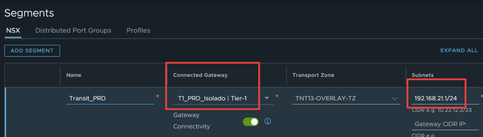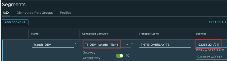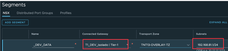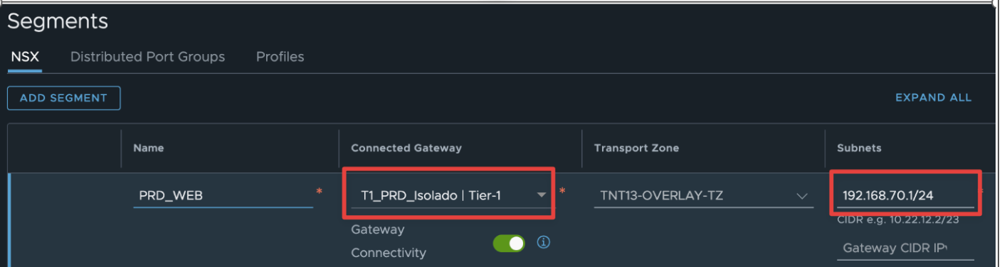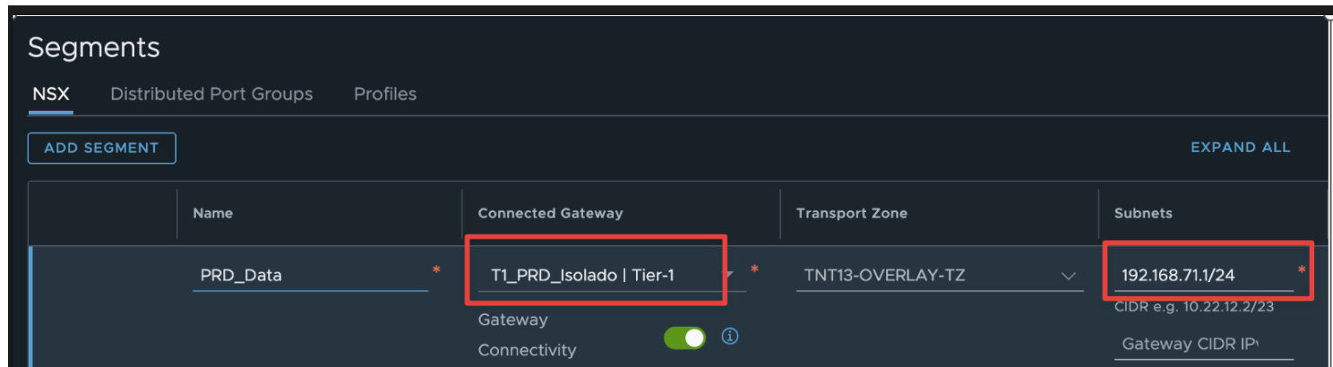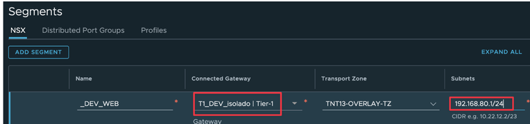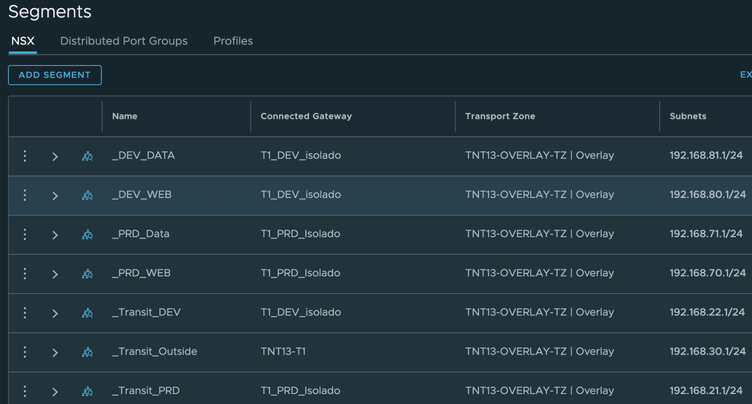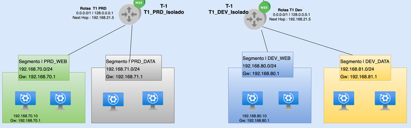 Importante: Estes Segmentos estarão conectados ao Tier-1 Gateway PRD (T1_PRD_isolado) e DEV ( T1_DEV_Isolado) respectivamente criados na etapa anterior