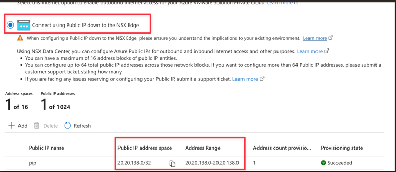 Na configuração Internet connectivity (egress/ingress) do Azure VMware Solution (AVS) irei utilizar a opção "Connect using Public IP down to the NSX Edge". Isso permite usar o NSX Data Center para criar regras de outbound e inbound (DNAT/SNAT) usando esses IPs públicos diretamente no Edge do AVS.