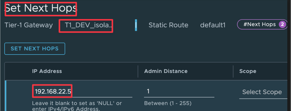Estarei criado uma rota default ( 0.0.0.0/0 ) , com next hop para a interface do Inside do PFsense (192.168.22.5 ) conectada ao Gateway T1 PRD. Devido a limitações do NSX, é necessário "quebrar" em duas: 0.0.0.0/1 e 128.0.0.1/1