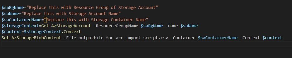 - Now, Upload the output file “outputfile_for_acr_import_script.csv” to any of the storage account in source tenant. Run Below Command to Set Storage Context and upload outputfile_for_acr_import_script.csv file to Storage Account container.