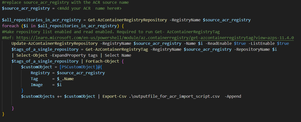 - Copy following script content to windows vm and save the file as export_source_images.ps1. Replace the highlighted variable with your ACR name.