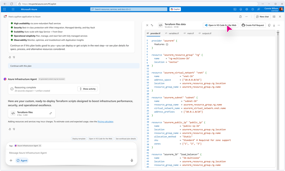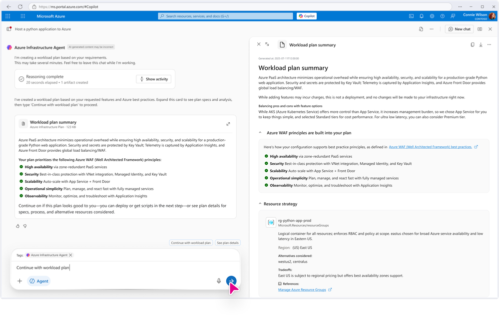 The agent automatically generates a comprehensive infrastructure plan based on the Azure Well-Architected pillars, detailing the proposed architecture, resource selections, and the rationale behind each choice. You have the opportunity to review and refine the plan before proceeding, ensuring it aligns with your specific requirements and best practices. -