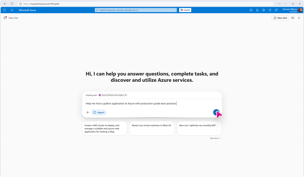 Once agent access is granted, navigate to the Azure Portal, select Copilot, and activate Agent mode. Begin by entering your requirements as a natural language prompt—for example, “Help me host a Python application on Azure following production-grade best practices.” The agent interprets your intent and guides you through each subsequent step.