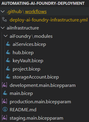Deploying AI solutions at scale requires more than just innovation; it necessitates automation. In this blog, we will explore how to optimize and standardize Azure AI Foundry deployments using Infrastructure-as-Code (IaC). By leveraging the declarative capabilities of Bicep alongside the automation features of GitHub Workflows, you can establish reproducible, secure, and fully automated deployment pipelines for your AI infrastructure. Whether you are developing proof-of-concepts or overseeing enterprise scale environments, this method guarantees agility, compliance, and operational consistency.