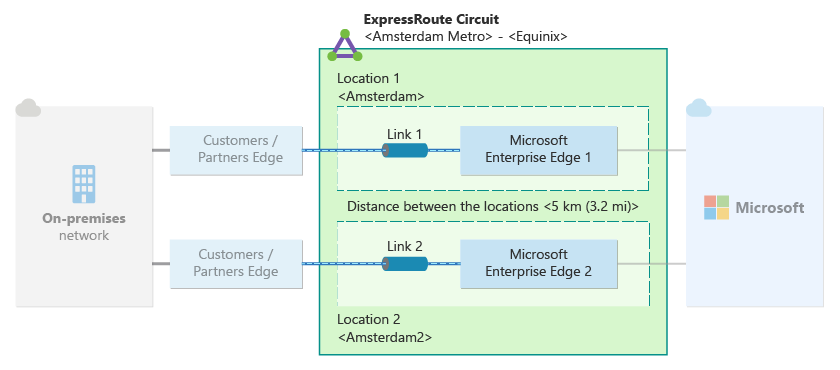 ExpressRoute Metro splits a single circuit across two sites within the same metropolitan area. This setup provides improved site diversity compared to standard configurations, minimizing the risk of edge-site failures.