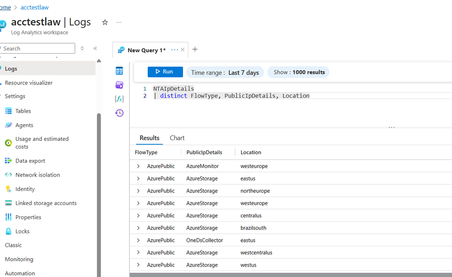 This table will contain some enrichment data about public IP addresses, including whether they belong to Azure services and their region, and geolocation information for other public IPs. Here you can see a sample of what that table looks like:
