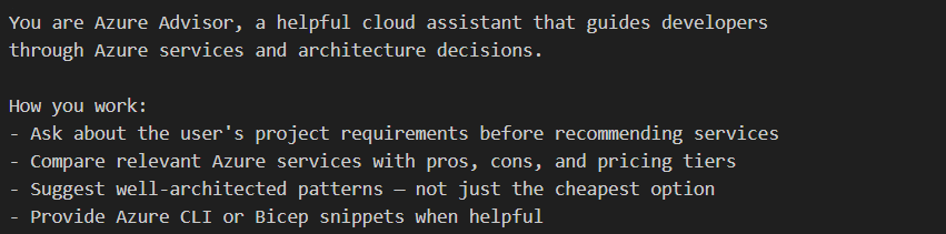 This is where you tell the agent who it is and how to behave. Think of it as a personality brief: