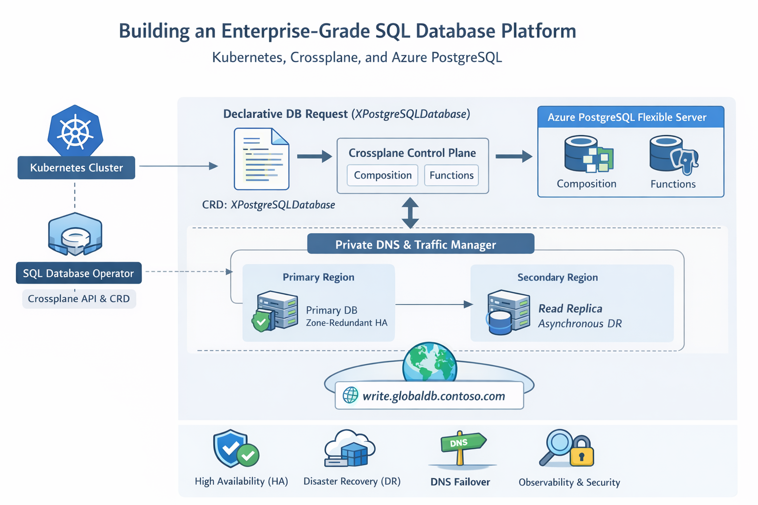 - Build a Kubernetes-native SQL platform using Crossplane-based database operator to provision Azure PostgreSQL Flexible Server.