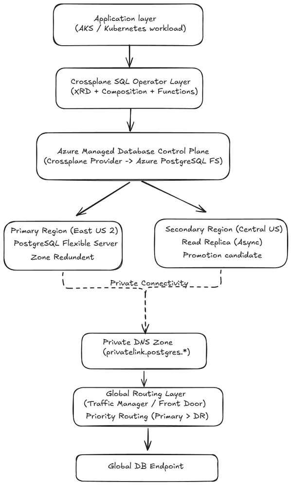 - Crossplane acts as the control plane, translating Kubernetes intent into Azure-managed DB resources