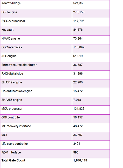 Several factors influence area size, but a common estimation method is based on logic gate count. The complete Caliptra subsystem, including accelerators for secure-boot attestation, identity, and recovery, totals 1,640,145 gates.