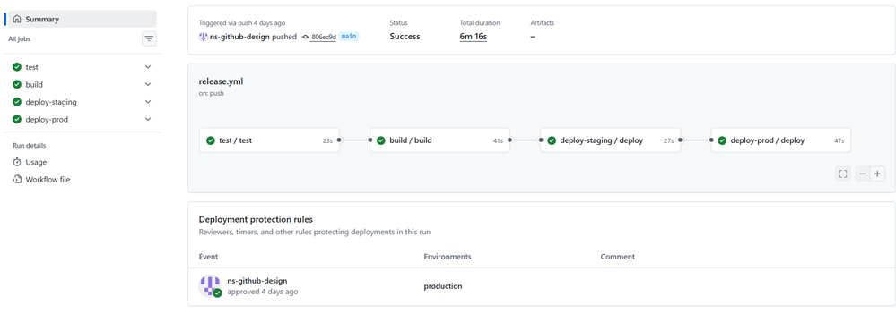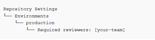 - GitHub Environments control approvals. Staging and production are separate environments with configurable protection rules — no custom approval logic needed.