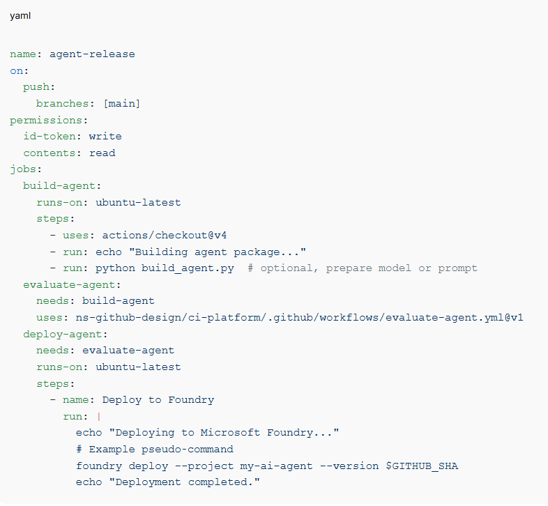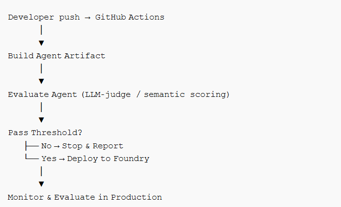 In Part 2, we extend the platform to answer that question. We introduce evaluation as a deployment gate — a reusable workflow that scores agent behavior before any deployment is allowed. We integrate with Microsoft Foundry for agent runtime and observability. And we show how the same platform-thinking from Part 1 applies directly to AI systems.