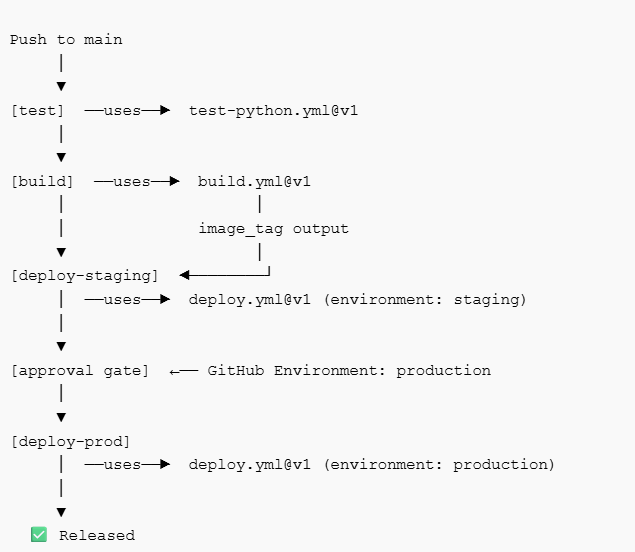 One change to deploy.yml in the platform repo propagates to every service on the next run. No manual updates. No drift. No inconsistency.