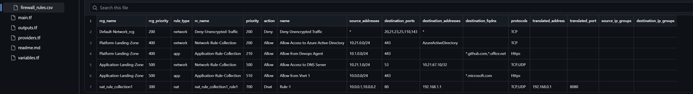 Define your Azure Firewall, NSG, and route table rules in CSV files. Each row represents a rule, making it easy to add, remove, or update entries as requirements change.