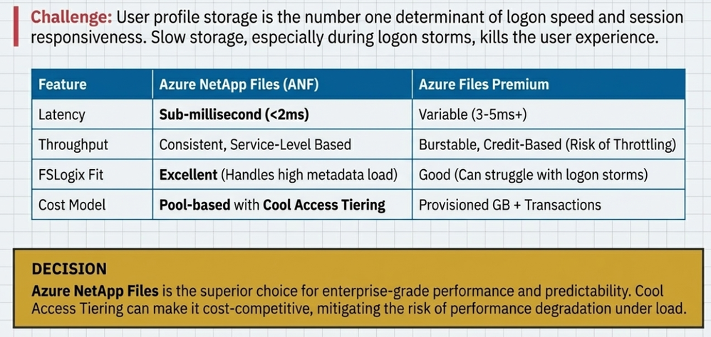 Use storage that can handle cross-region workload needs, especially for user data or state. In case of Citrix Daas, preferred approach is Azure NetApp Files (ANF) for consistent sub-millisecond latency and high throughput. ANF provides enterprise-grade performance (critical during “login storms” or peak I/O) and features like Cool Access tiering to optimize cost, outperforming standard Azure Files for this scenario.