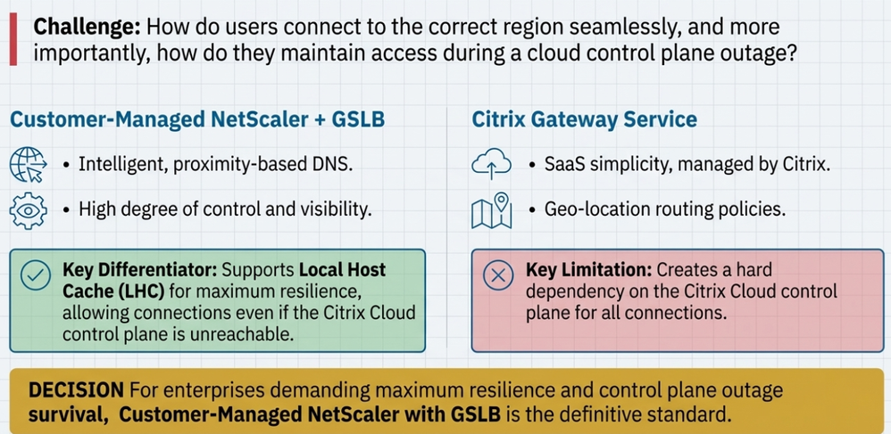 Ensure users/customers connect to the right region and can fail over seamlessly. Preferred: Deploy a global traffic management solution under your control e.g. customer-managed NetScaler (Citrix ADC) with Global Server Load Balancing (GSLB) to direct users to the nearest available datacenter. In our design, NetScaler’s GSLB uses DNS-based geo-routing and supports Local Host Cache for Citrix, meaning even if the cloud control plane (Citrix Cloud) is unreachable, users can still connect to their desktop apps. The general point: use Azure Front Door, Traffic Manager, or third-party equivalents to steer traffic, and avoid any solution that introduces a new single point of failure in the authentication or gateway path.