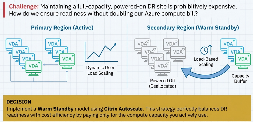 For our scenario, we leverage Citrix Autoscale to keep the DR site in a minimal state only a small buffer of machines is powered on, just enough to handle a sudden failover until load-based scaling brings up the rest. This “active/passive” model (or hot-warm rather than hot-hot) strikes a balance: you pay only for what you use, yet you can meet your RTO (Recovery Time Objective) because resources spin up automatically on trigger. In cloud-native terms, you might use Azure Automation or scale sets to similar effect. The key is to avoid having an idle full duplicate environment incurring full costs 24/7, while still being prepared.