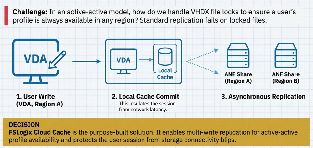 Solution: FSLogix Cloud Cache (in a VDI context) or similar distributed caching/replication tech, which allows simultaneous read/write of profile data in multiple regions. In our case, Cloud Cache insulates the user session from WAN latency by writing to a local cache and asynchronously replicating to the secondary region, overcoming the challenge of traditional file locking. The principle extends to databases or state stores: use geo-replication or distributed databases to avoid any single-region state.