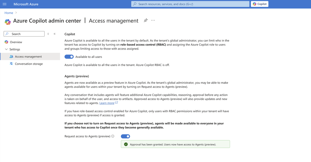 To start using agents, your global administrator must request access to the agents preview at the tenant level in the Azure Copilot admin center.