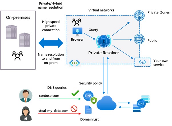DNS security policy was launched recently and offers the ability to filter and log DNS queries at the virtual network (VNET) level. Policy applies to both public and private DNS traffic within a VNET. DNS logs can be sent to a storage account, log analytics workspace, or event hubs. You can choose to allow, alert, or block DNS queries.