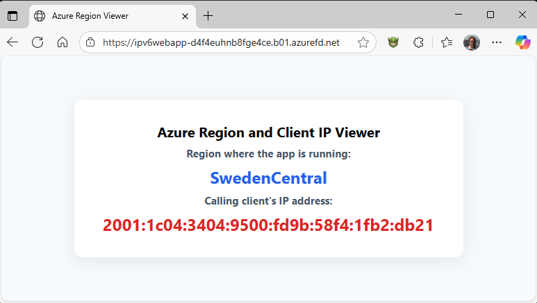 Calling the application's api endpoint on `ipv6webapp-d4f4euhnb8fge4ce.b01.azurefd.net/api/region` shows some more detail.