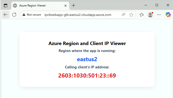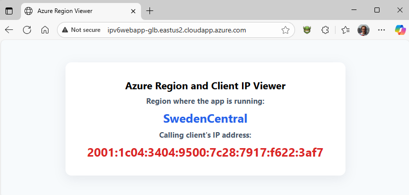 Example: Consider a web application running on a VM (or a VM scale set) behind an External Load Balancer in Sweden Central. The VM runs the Azure Region and Client IP Viewer containerized application exposed on port 80, which displays the region the VM is deployed in and the calling client's IP address. The load balancer's front-end IPv6 address has a DNS name of ipv6webapp-elb-swedencentral.swedencentral.cloudapp.azure.com. When called from a client with an IPv6 address, the application shows its region and the client's address.