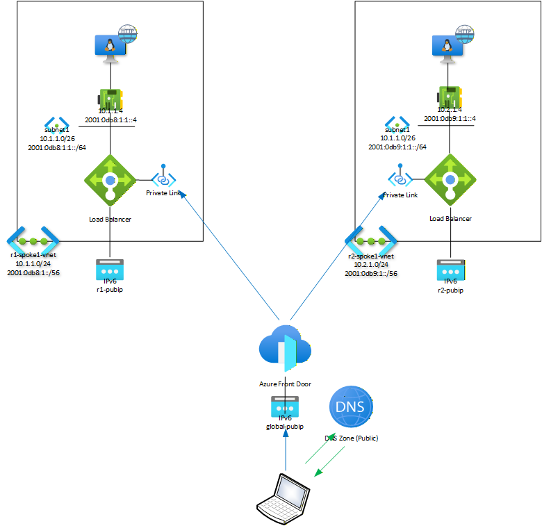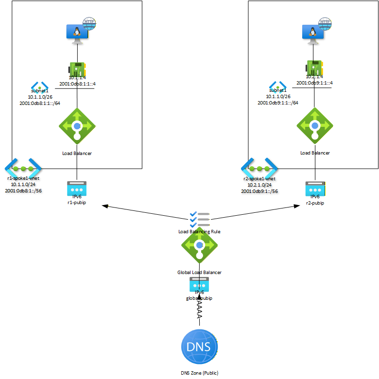 - Deploy Regional Load Balancers: Create Standard External Load Balancers in multiple Azure regions (e.g. Sweden Central, East US2). Configure each with dual-stack frontends (IPv4 and IPv6 public IPs) and connect them to regional VM deployments or VM scale sets running your application.