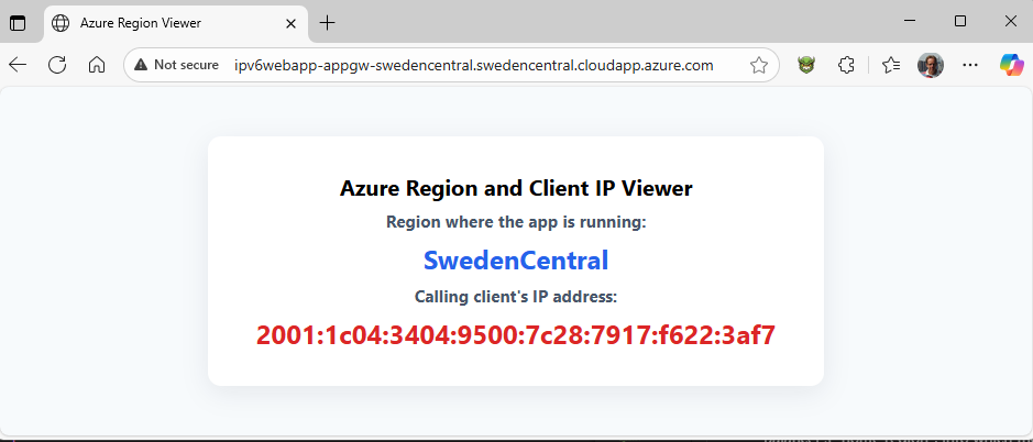Name : ipv6webapp-appgw-swedencentral.swedencentral.cloudapp.azure.com