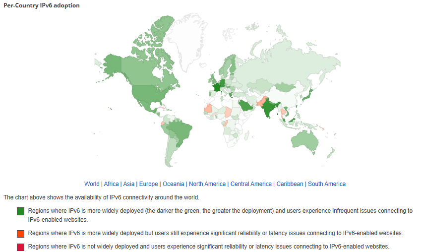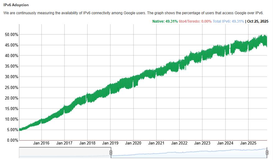 Client uptake of IPv6 is progressing steadily. Google reports 49% of clients connecting to its services over IPv6 globally, with France leading at 80%.
