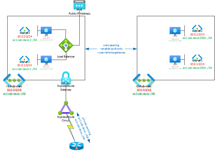 Azure's private networking capabilities center on Virtual Networks (VNETs) and the components that are deployed within. Azure VNETs are IPv4/IPv6 dual stack capable: a VNET must always have IPv4 address space allocated, and can also have IPv6 address space. Virtual machines in a dual stack VNET will have both an IPv4 and an IPv6 address from the VNET range, and can be behind IPv6 capable External- and Internal Load Balancers. VNETs can be connected through VNET peering, which effectively turns the peered VNETs into a single routing domain. It is now possible to peer only the IPv6 address spaces of VNETs, so that the IPv4 space assigned to VNETs can overlap and communication across the peering is over IPv6. The same is true for connectivity to on-premise over ExpressRoute: the Private Peering can be enabled for IPv6 only, so that VNETs in Azure do not have to have unique IPv4 address space assigned, which may be in short supply in an enterprise.
