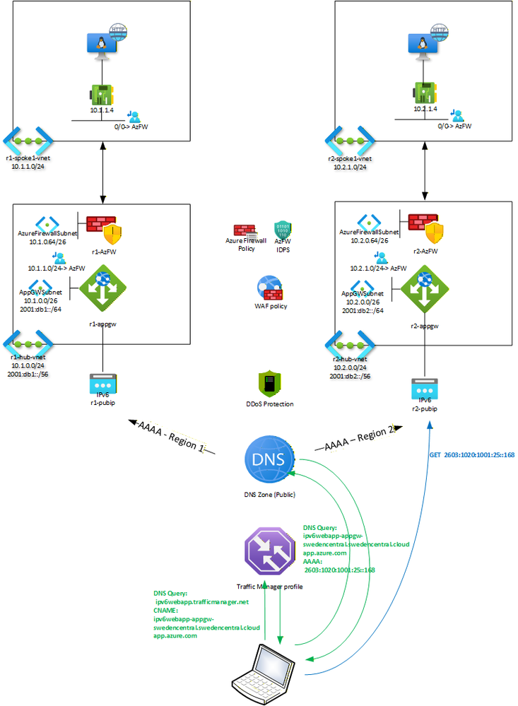 5. Client connects: The client’s browser connects to the West Europe App Gateway IPv6 address directly. The HTTP/S session is established via IPv6 to that regional gateway, which then handles the request.